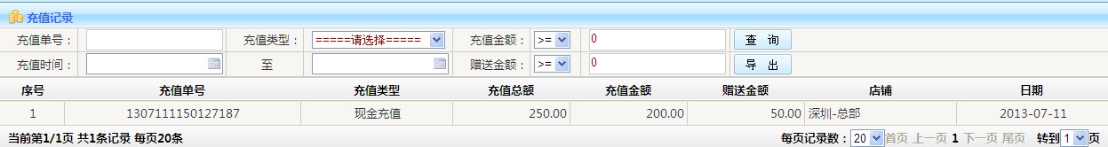 充值記錄: 1.查詢:可以根據(jù)充值單號(hào) 時(shí)間段 充值類(lèi)型等條件查詢 2.導(dǎo)出:可以將按條件查詢出來(lái)的數(shù)據(jù),以Excel表格形式導(dǎo)出