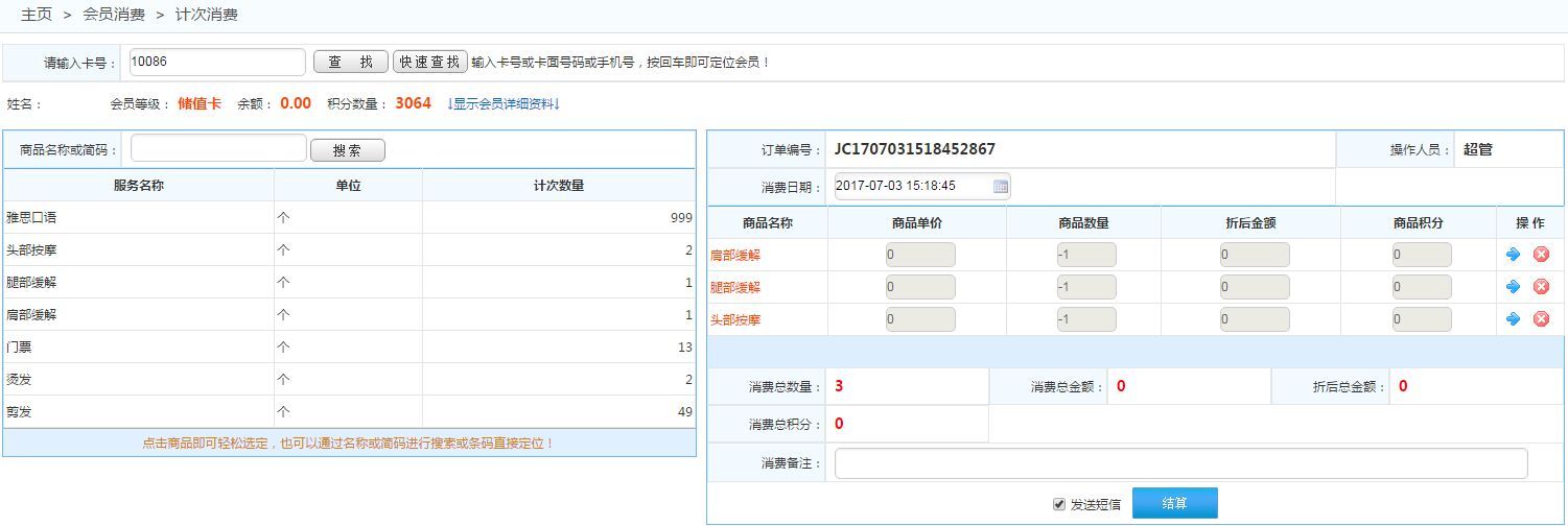 通過(guò)刷卡,或者通過(guò)查詢(xún)定位到會(huì)員,然后在左側(cè)選擇服務(wù)類(lèi)型商品進(jìn)行計(jì)次消費(fèi) 如下圖:
