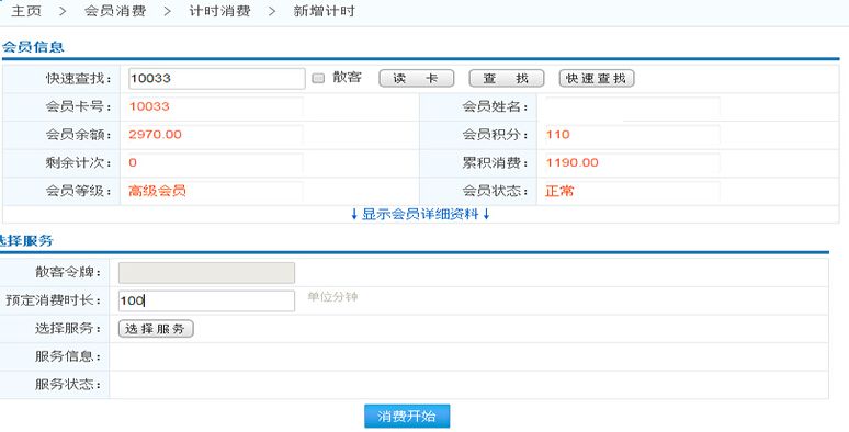 在文本框中輸入會(huì)員卡號(hào),可查詢?cè)摃?huì)員的計(jì)時(shí)消費(fèi)記錄