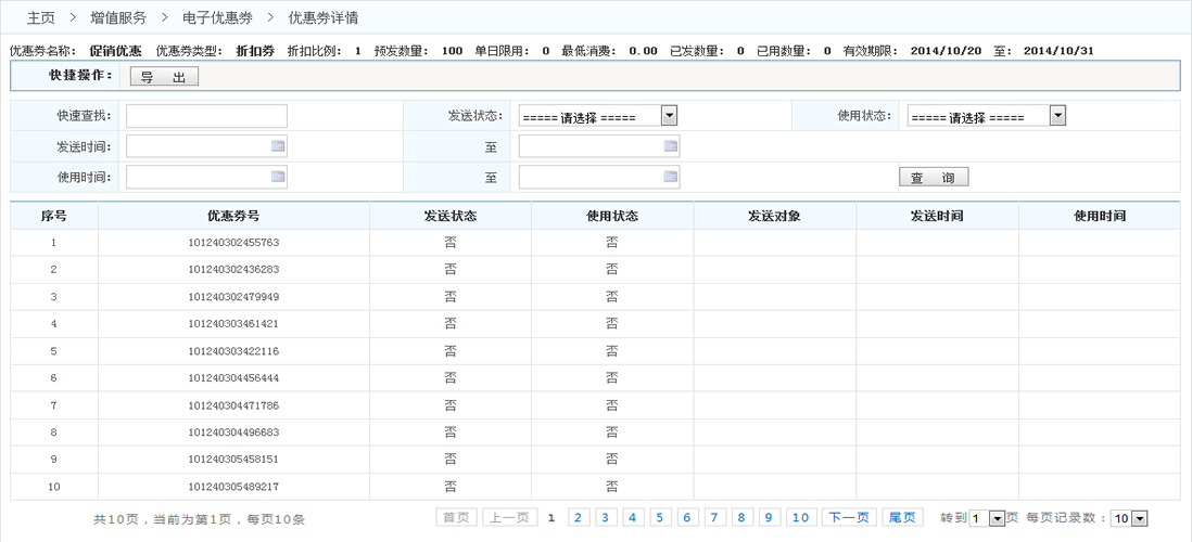 查詢(xún)提交:可以根據(jù)提供的一些條件分類(lèi),查出所需要的數(shù)據(jù)(包括發(fā)送狀態(tài) 使用狀態(tài)以及時(shí)間等條件)
